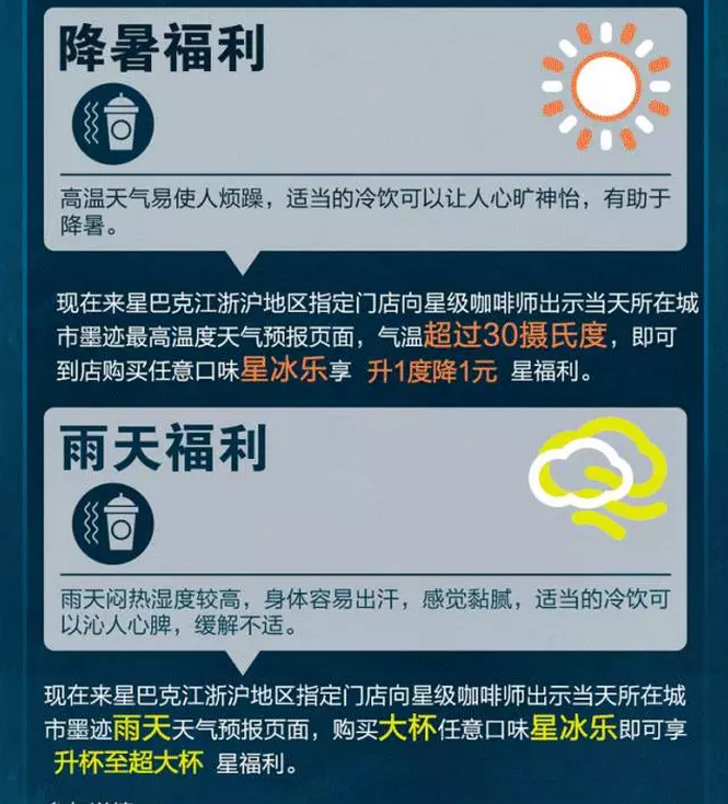 2015年雨季时节各大快消品牌的买一送一还历历在目,只要关乎民生的天气变,此招仍凑效。今夏我们首先迎来了墨迹天气星巴克的合作,推出“天气星玩法”。活动规定,6月1日30日期间,江苏、浙江、上海地区墨迹天气的用户可凭借墨迹天气端内“天气星”活动页面到当地指定的星巴克门店领取福利。活动为用户提供了降暑和雨天两种福利可供选择。用户到店出示墨迹天气播报的当日所在地温度页面,只要气温超过30摄氏度,即可获得购买星冰乐(任意口味)升1度降1元的“降暑福利”;用户到店出示墨迹天气播报的当日所在地降雨页面,即可获得购买大杯(任意口味)星冰乐免费升超大杯的“雨天福利”。有福利谁不想占,这也让时刻关注天气的老百姓多了一份乐趣。